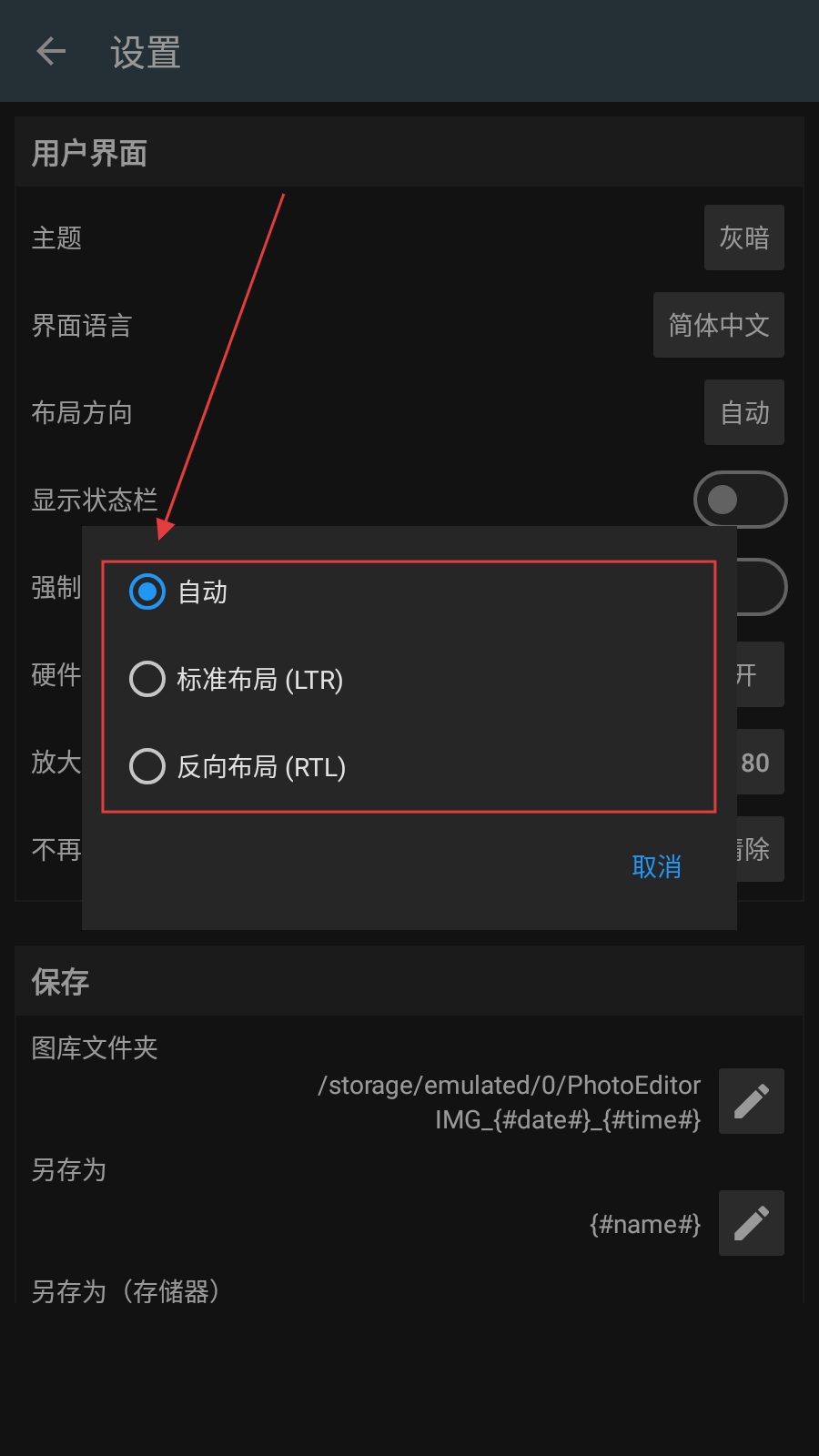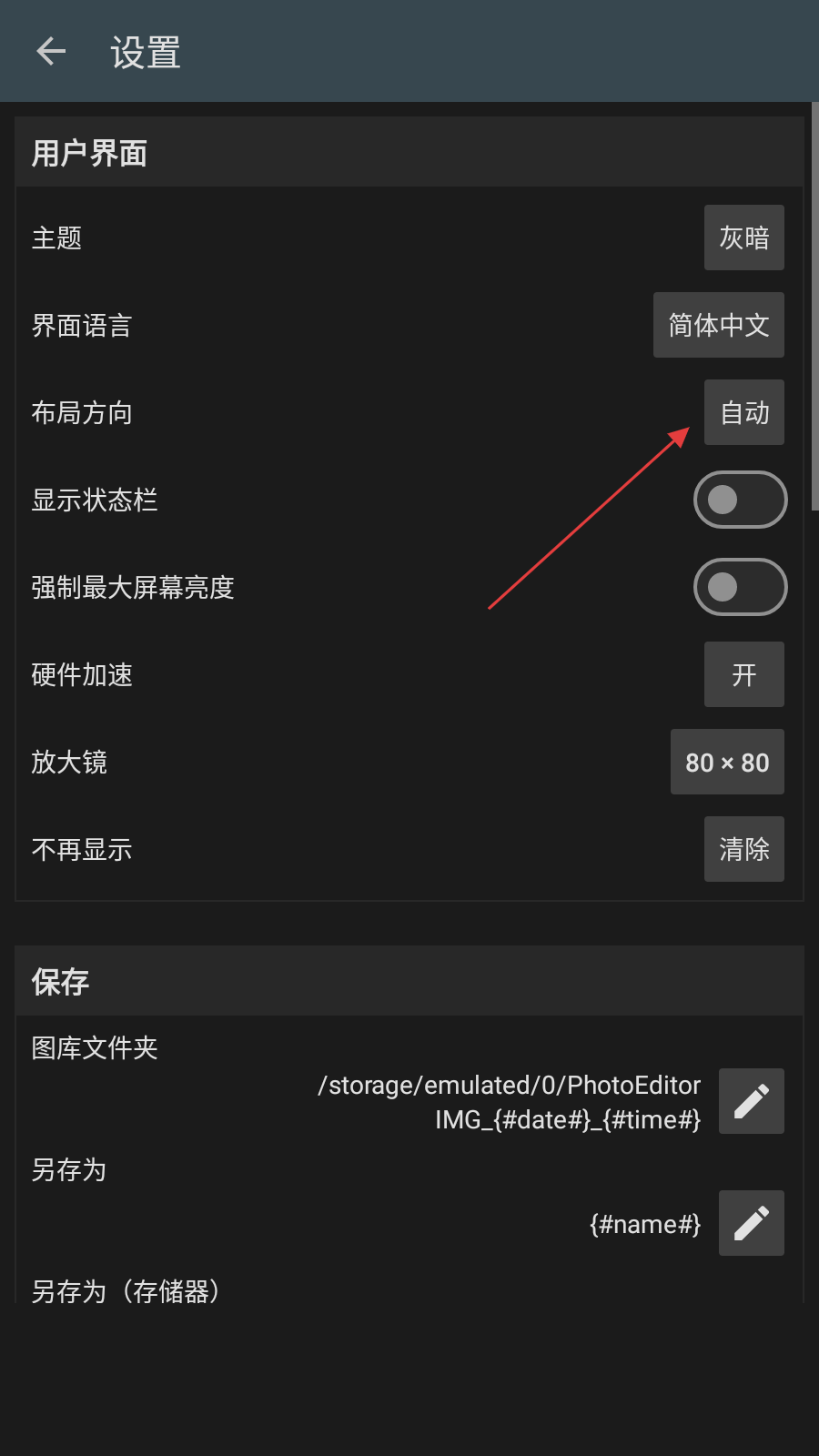 3、在设置界面的用户界面板块下,找到布局方向选项,点击其右侧的按钮。
