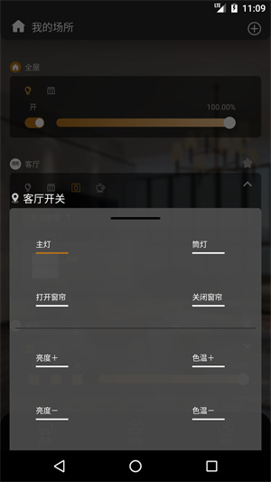 - 不同房间的灯光分类显示,点击一键开启或关闭,还能调节亮度等;