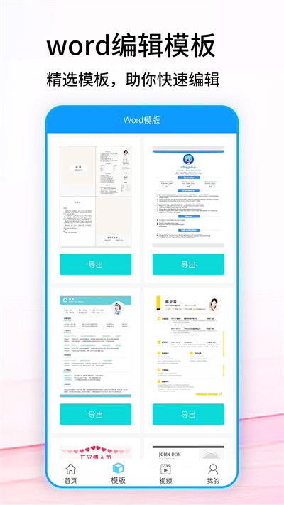 word文档编辑为您提供了各种模板素材,包括:个人简历制作模板、工作总结模板等,让您的手机办公更高效;
