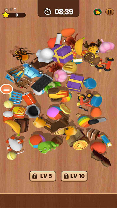 1、找到相同的两件物品进行消除,玩家需要在一堆乱七八糟的物品中找出相同的相同的两件,不同的是不能消除的;