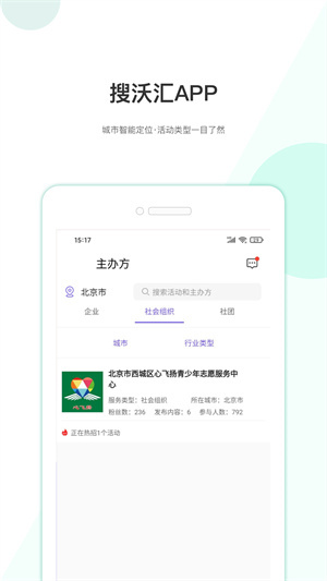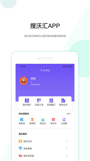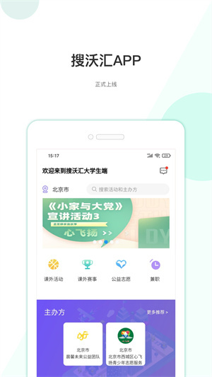 搜沃汇是一款学生社会实践综合服务平台,让孩子学到一些书本上学不到的知识,提出学生素质教育的新途径,继承和发扬我国的教育理念和人文精神,把你所有的经历完整地记录下来,并能从中学到东西,学生用户可以通过本软件报名参加各种活动。