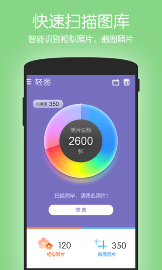 轻图(照片清理神器)是一款工具类手机软件,它具有自动筛选功能,把未处理照片进行集中分类呈现,当手机里的照片达到一定数量是会自动提醒清理,将重复的照片和大量的截图照片一一整理好可以集中清理,是管理照片的好工具,喜爱的朋友赶快下载体验吧!
