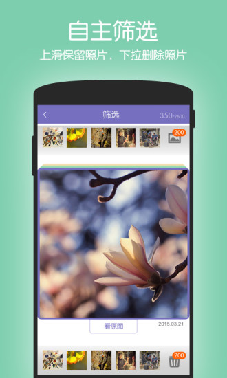 1.自主筛选:轻图最与众不同的地方就在于它的自主筛选功能。图库中所有未处理的照片轻图将为你集中呈现。你可以依据自己的喜好,上拉照片将其归为保留项,下滑照片把它丢到回收站。全选删除回收站中的照片,即刻释放手机内存。轻图就像个照片清理管家,为你细化清理条理,再也不用担心清理照片毫无头绪咯!
