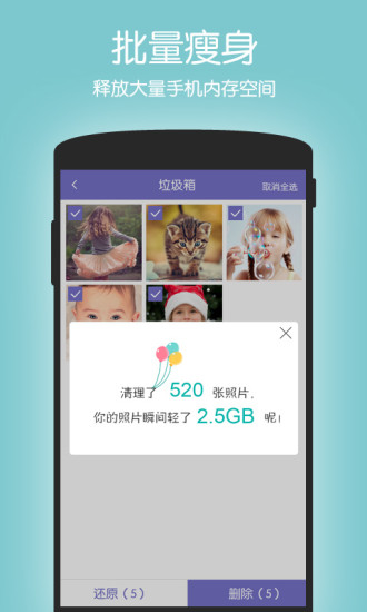 4.截图照片清理:那些个散布在天南海北的截图,再也不需要暴走翻找挨个删除了。轻图一键为你识别出所有的截图照片,等你来集中勾选。一键删除所有的临时截图,立刻使图库告别臃肿,马上瘦下来!