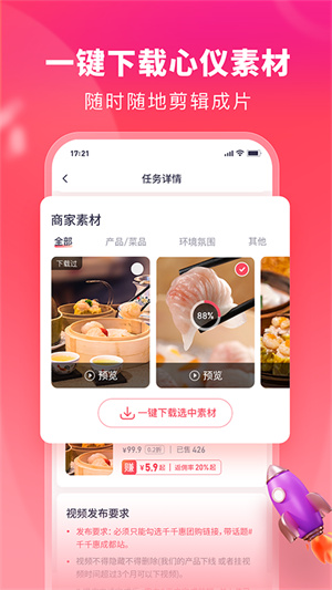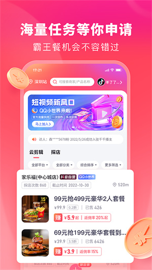 - 集合全国各地探店和云剪辑多样赚佣任务,更有红包和霸王餐福利等你认领;