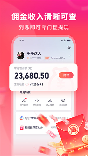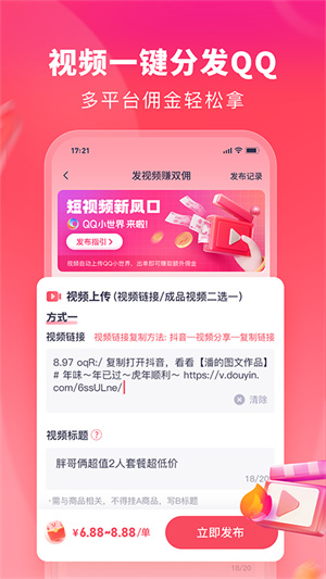 - 除抖音平台外还支持视频一键同步QQ小世界,一次创作,多平台赚很多的佣金;