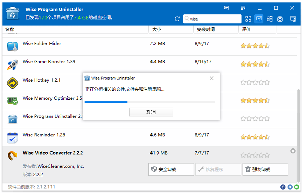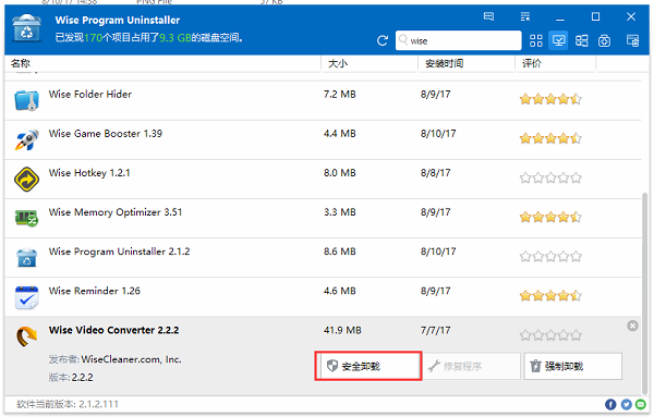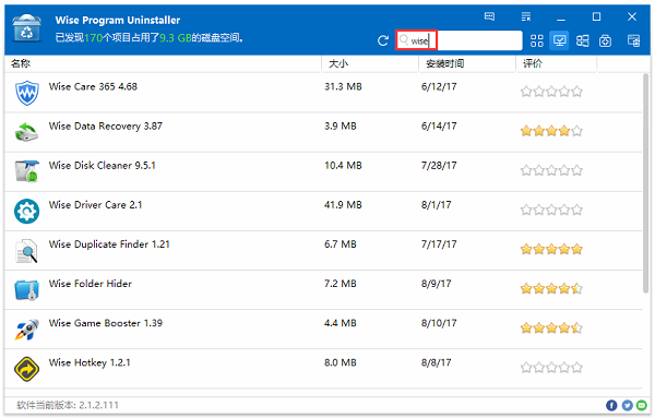Wise Program Uninstaller软件是WiseCleaner出品的一款完全免费的程序卸载(卸载程序)工具,软件提供了安全卸载、程序修复、强力卸载以及删除条目等几项主要功能,当安装程序较多时,可以方便地通过软件内置的搜索器进行快速查找,有效提高查找效率。