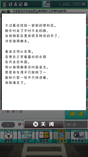 3.随着游戏的进行,屏幕左上角的日期会不断增加,游戏男主角阿隆也会用他的智能机记录下日常的故事。阿隆是一个38岁的自由职业者,即将奔四,啃老一族,喜欢二次元,无所事事,被父母催促着找了一份便利店收银员的工作。虽然不擅长面对社会,其实阿隆内心十分善良。