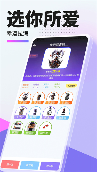 该应用如今给予了大家更多的盲盒抽取的乐趣,给予大家购买是哪个从开始就有期待,针对现在的是购买上如今也是非常的方便,购买自己的产品就能拥有更多的盲盒系列。