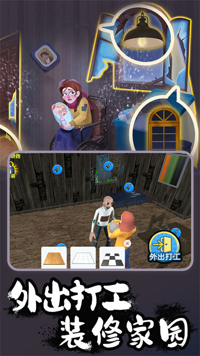 室内装修模拟游戏是一款简单有趣的模拟经营游戏,游戏里有一栋非常破旧的房子,玩家要做的就是打工赚钱,将房子重新装修,让老婆孩子过上好生活,不用再为住在哪里发愁,游戏的玩法很轻松,你能给家人打造一个温暖幸福的家吗。