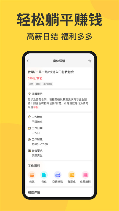 该应用功能上也是非常的安全,可以给予用户们超多的支持和选择,我们在面对现在的兼职的选择上,如今线上兼职也是非常的不错,可以满足学生党和上班族的兼职需要。