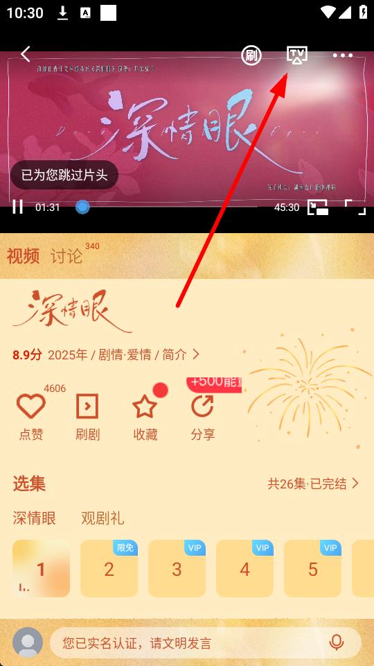 3、在视频播放页面,点击右上角带有TV标志的投屏按钮。
