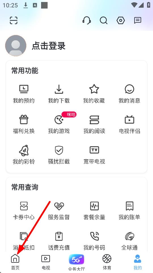 1、打开咪咕视频app,点击底部导航栏中的首页进入首页界面。