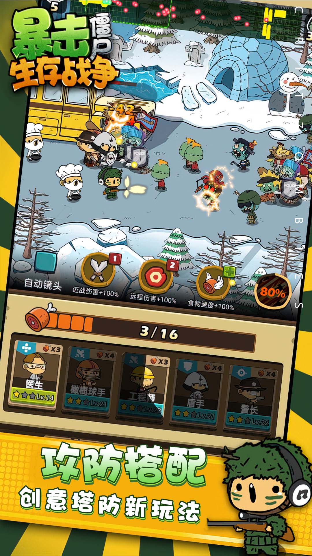 暴击僵尸生存战争游戏是一款休闲的游戏,玩家进入游戏来到一个奇怪的世界,这里有很多的僵尸向我们袭来,我们需要组建强大的防线来抵御僵尸的进攻,里面的僵尸种类很多,我们需要不同的角色来进行攻击,里面的场景是非常精致的,玩起来很带感。
