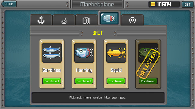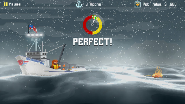 点击,点击,再点击,完了。这就是游戏所有的操作方式,也许你会说很多,很多卡牌战旗游戏也是这样点点点的,可是本作里是无脑点点点,比挖金矿还无脑,人家只好还得想想角度速度什么的。本作中除了下钩那一下需要让一个不停转的指针停在圆盘的绿色区域外,就不用过多的思考了。鱼箱在水中还需哟啊移动一段距离,果不其然海中生物纷纷过来捣乱,要怎么样才能不被它们侵蚀我们的战果,勇敢的船长果断使用声呐武器驱赶,怎么操作的?无脑点点点,在各种海洋生物靠近前冲他们头上一点,一个代表声音的扩散圆圈就会出现,从而能把捣乱的生物赶走。