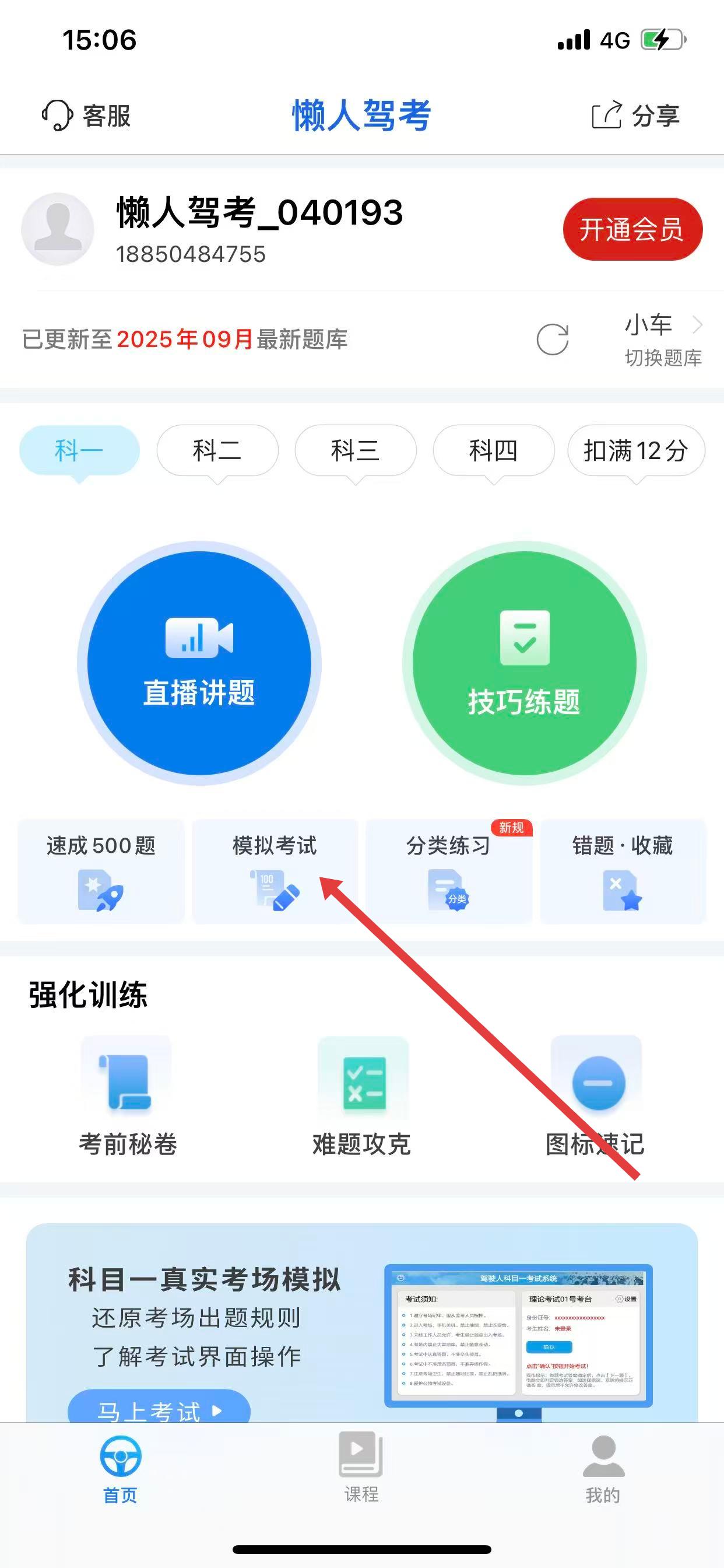 1、打开懒人驾考APP,进入首页,点击模拟考试图标。