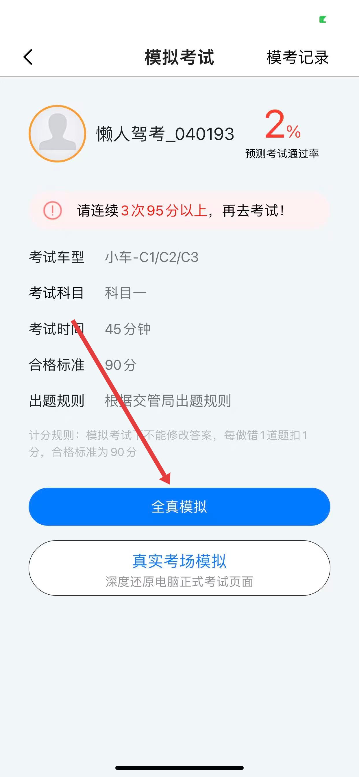 2、进入模拟考试页面,查看考试相关信息后,点击全真模拟按钮。