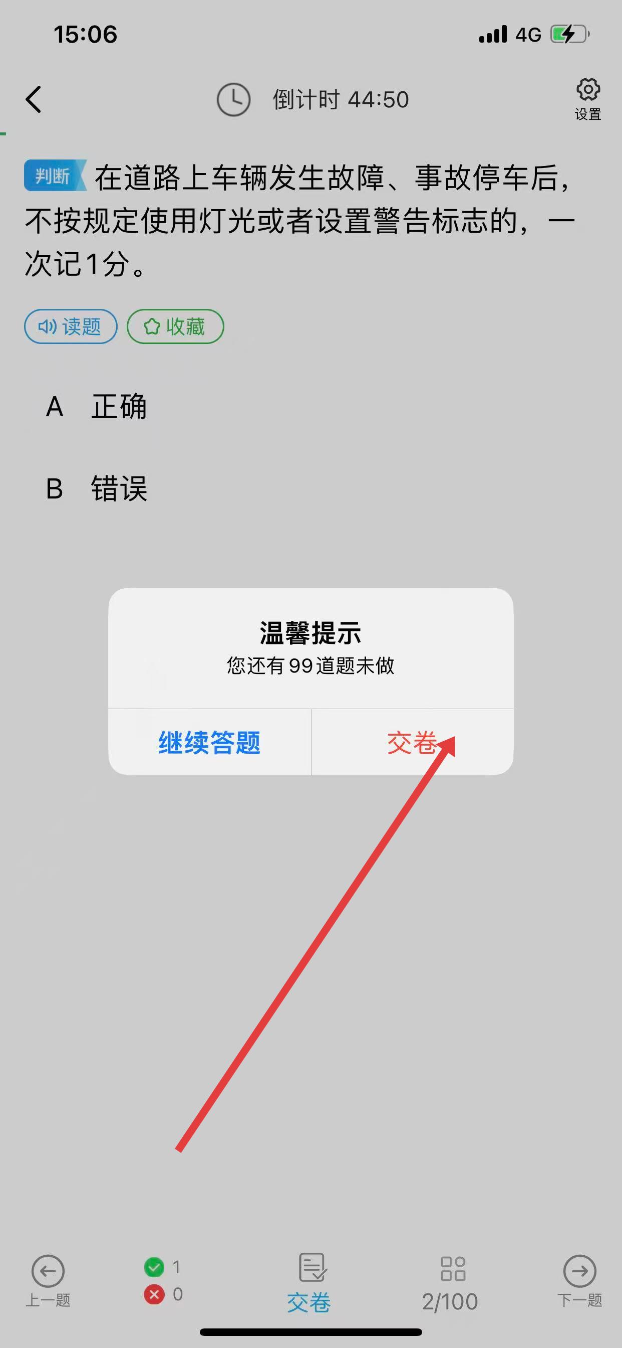 4、答题中途点击交卷,会弹出提示窗口,确认是否交卷,若确认点击交卷。