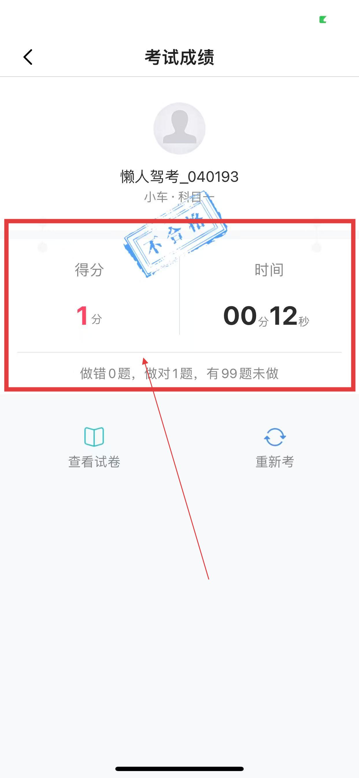 5、交卷后进入考试成绩页面,查看考试得分、用时以及错题和对题数量等信息。