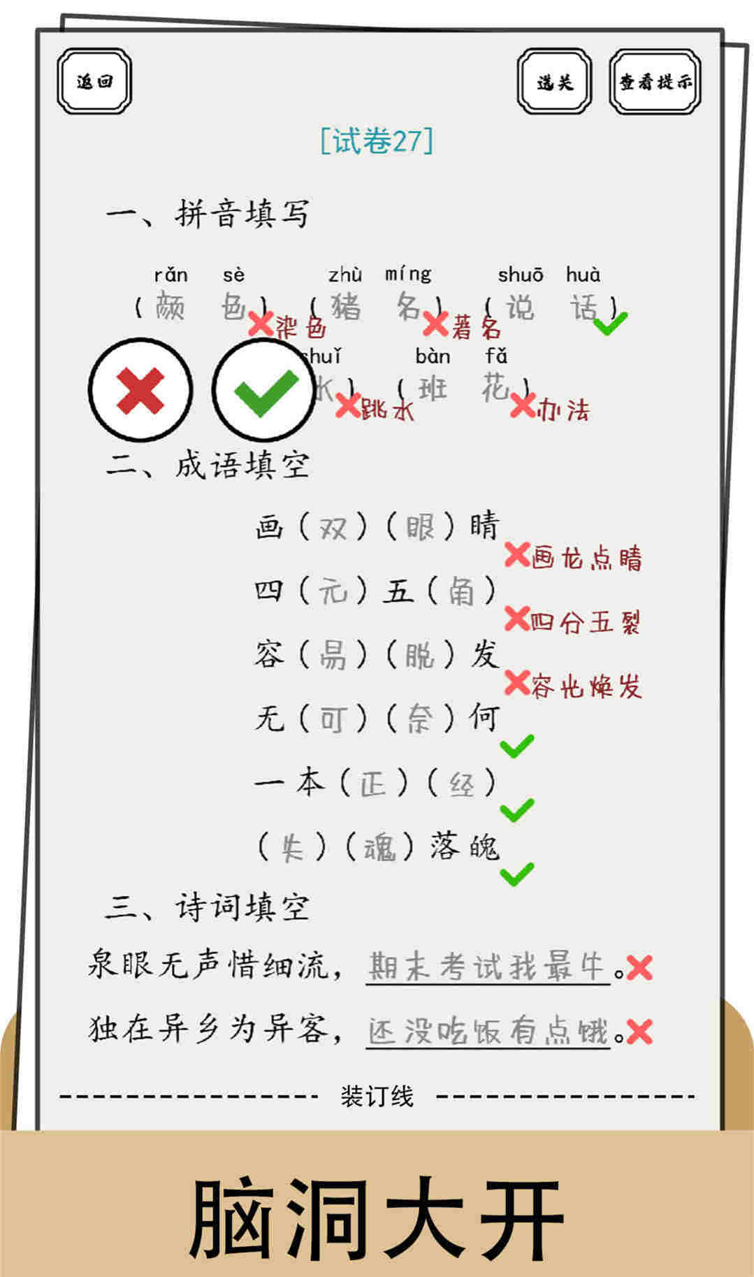 脑洞的答卷游戏是一个非常有趣烧脑的游戏,玩家将在游戏中扮演一位正在给学生们批改试卷作业的老师,有着各种各样不同的关卡模式,每一个关卡都是一份试卷,玩家需要解答试卷上面的问题,非常烧脑的谜题,放飞自己的想象力才可以顺利答题。