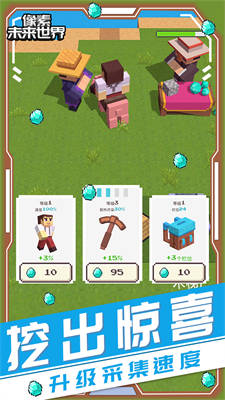 像素未来世界游戏一款休闲游戏,在这款游戏中你可以建造任何你想见到的东西,收集资源后发挥想象力建造不同的宏伟建筑,这个巨大的沙盒世界还在等你探索,砍伐树木、挖掘石材矿物,采集羊毛收集牛奶等等,收集这些东西需要花费很多时间,但是你可以雇佣擅长这方面的村民,让他们成为伐木工、石匠、矿工等等来帮助你收集制作,不用担心游戏太肝。