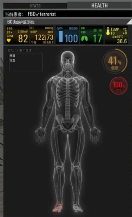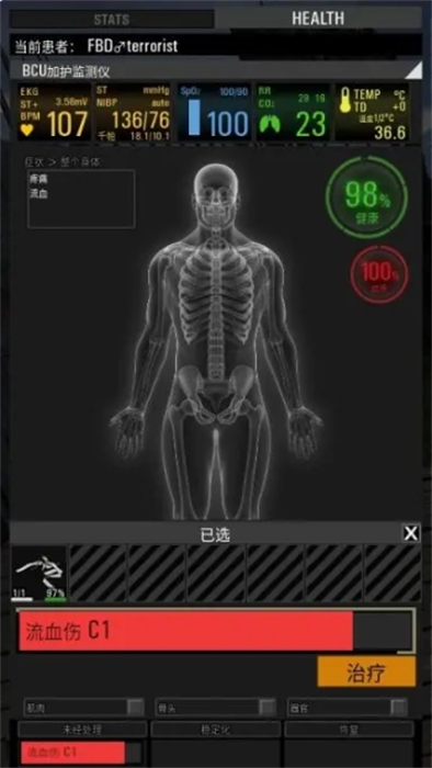 3、当选定好治疗所需的药品时,即可点击伤口条状标识右下角的【治疗】进行包扎;