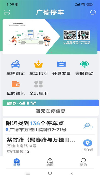 广德停车APP是一款非常好用的智慧停车软件,能够帮助用户更好的进行停车,功能非常的多样,不仅为用户提供附近的各种停车场的信息查询,查看附近的空闲车位,还能直接在线上预约各种需要的车位,享受更加便捷的停车服务,不用担心会找不到停车位,方便用户出行。