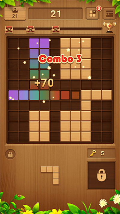 1、轻松休闲的游戏玩法,游戏中玩家需要将各种形状不同的方块合理安置到不同的位置,让它们和之前的方块形成完整的行列就可以成功消除;
