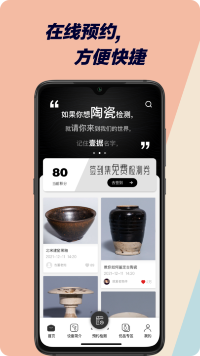 壹据技术检测app是一款可以帮助用户对瓷器进行检测的软件,提供的功能十分的丰富多样,用户能够在平台进行在线预约瓷器检测,快速的得出检测报告,支持用户将报告下载下来,提供的服务功能都是大家需要的,大家还能在平台每天签到打卡,获得更多的福利。