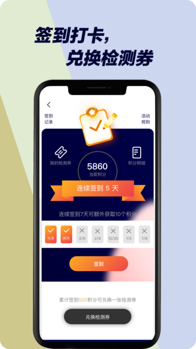 1、平台支持用户进行每天的任务打卡,可以获得对应的积分,兑换检测券;