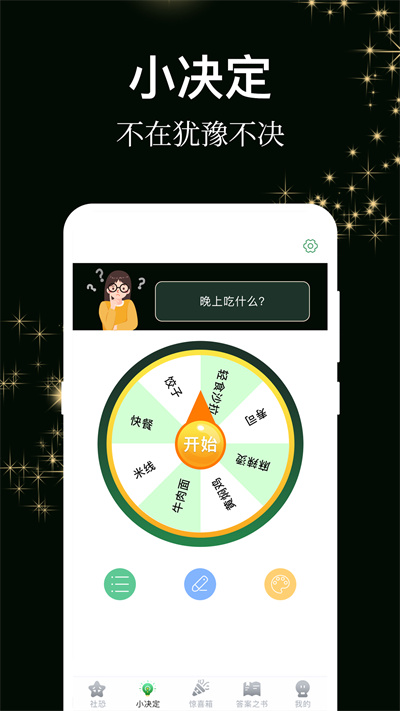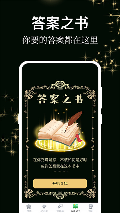 答案之书小决定app是一款可以给予大家获取更好的答案所打造的应用软件,在针对目前人们的选择变多后,人们也常常会纠结自己的平时选择,所以为了可以更好的给予各位选择,该应用给予了大家决定。