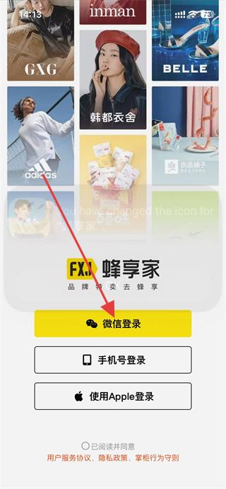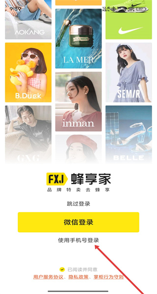 1、点击“温馨提示”弹窗的“同意”,进入蜂享家登录选择页面。