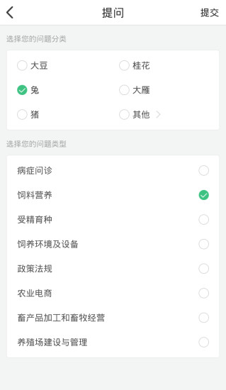 养殖包括病症问诊、饲料营养、受精育种、饲养环境及设备、政策法规、农业电商、畜产品加工和畜牧经营、养殖场建设与管理等。