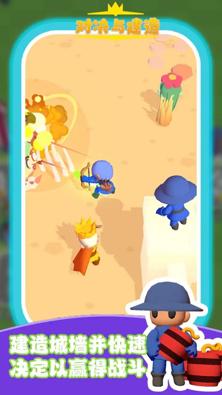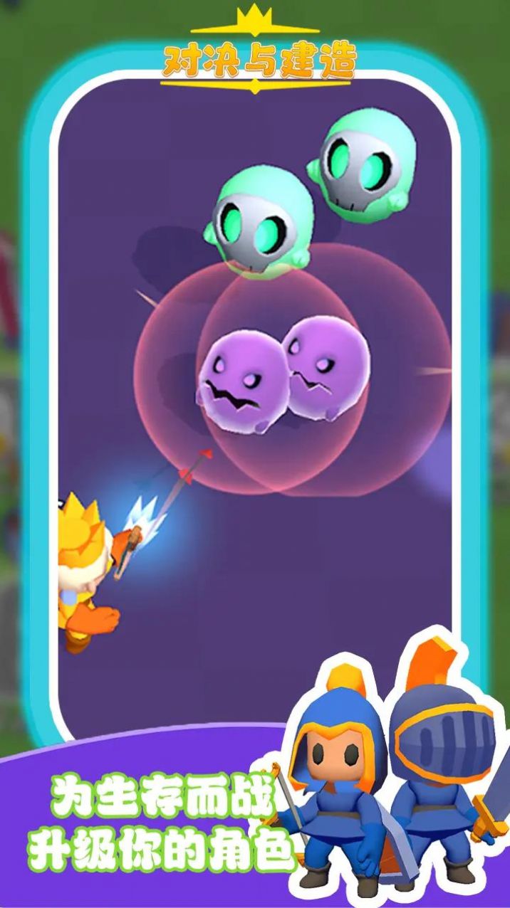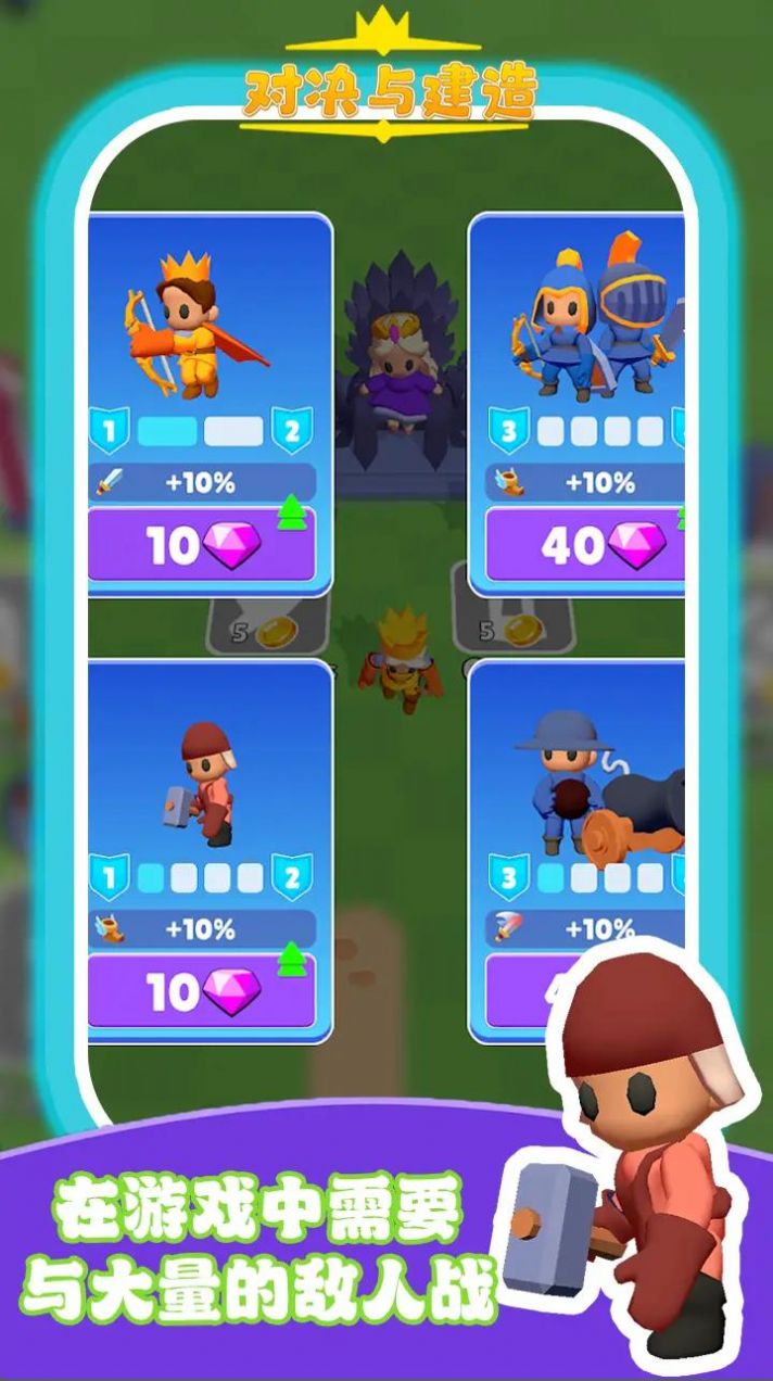 对决与建造是一款休闲的游戏,玩家选择自己的角色,跟大量的敌人进行战斗,有很多的不同的角色可以招募,慢慢的提升自己的实力,通过关卡,获得大量的奖励和资源,扩大自己的地盘,快来尝试下。
