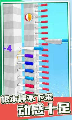 2、操控飞刀,不断的进行抛掷,让小球精准的落在你的刀片上,考验玩家的反应能力。
