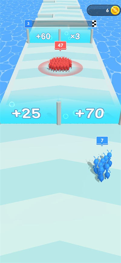 蚂蚁跑者是一款休闲的游戏,玩家控制自己的蚂蚁进行闯关,关卡是相当的丰富的,有大量的障碍物和陷阱需要我们进行躲避,通过不同的倍数门,增加蚂蚁的数量,直接从正面冲击过去,快来到游戏里尝试下。