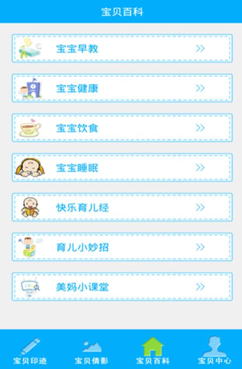 1.宝贝百科,宝贝百科是专为宝贝健康成长定制的栏目,主要有“宝贝早教、宝宝健康、宝宝饮食、宝宝睡眠、快乐育儿经、育儿小妙招、妈咪小课堂”七大板块。相关专家每天会针对各个栏目发布育儿妙招,是妈妈们必看、必学的重要板块,也是软件核心内容板块之一。