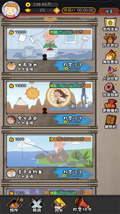 打工人的一天游戏是一款放置类休闲游戏,这里有很多不同的人物,他们来自于历史或者传说之中,在来到了现代之后,他们开启了直播,在这个过程中会发生哪些有趣的事情呢,有名的历史神话人物在这里也是一个辛苦的打工人,玩家可以观看他们的行为,看看直播会发生什么有趣的事情。