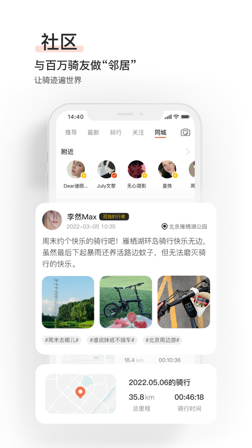 骑记不仅是一种积极的运动形态,更是一种健康的生活方式,是一件充满乐趣的事。400万公里骑行里程的积累,200天的用户关爱反馈。