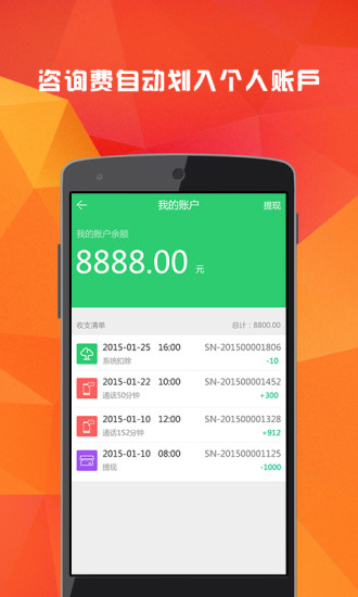 自动结算咨询费:咨询结束后,系统将自动根据双方通话的时间算出咨询费,并即时计入咨询师的账户