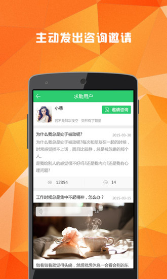 主动发出咨询邀请:咨询师根据用户发布的求助内容给用户发出咨询邀请,用户接受后即可进行电话咨询