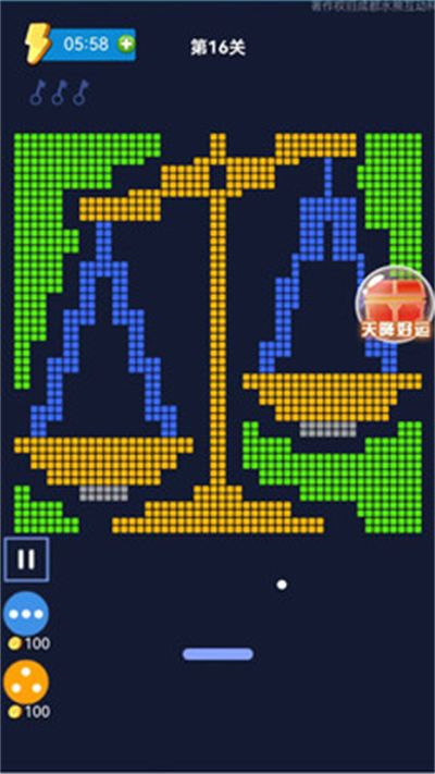 1、及时接住小球,玩家需要在小球发射出去以后,在它下落之前及时滑动挡板接住,如果小球掉下去,则游戏失败;