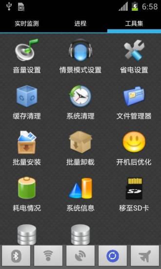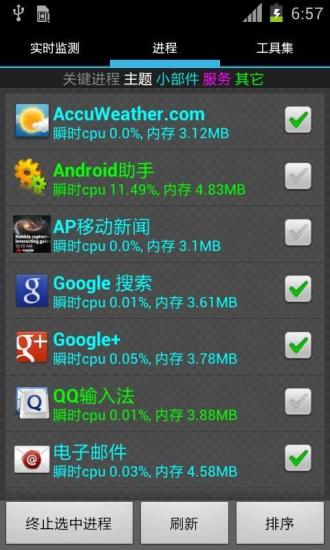 监控状态(cpu, 内存, 电池:android助手提供实时的CPU,内存和电池状态,可以帮助您及时监测系统的性能.