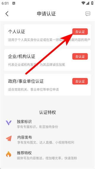 3、在申请认证页面,点击个人认证右侧的去认证,进入个人认证页面。
