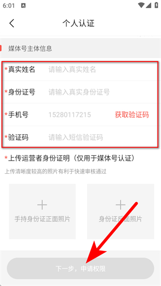 4、在个人认证页面,填写信息后点击下一步,申请权限,完成认证操作。
