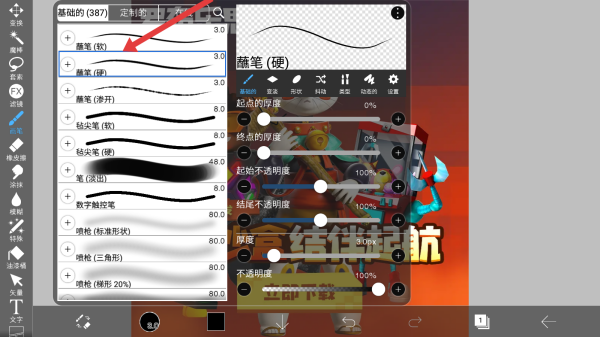 2、进入笔刷选择界面,在基础笔刷列表中找到并点击熏笔(软),选定该笔刷后,可进一步调整其起点浓度等参数,适配绘画需求。