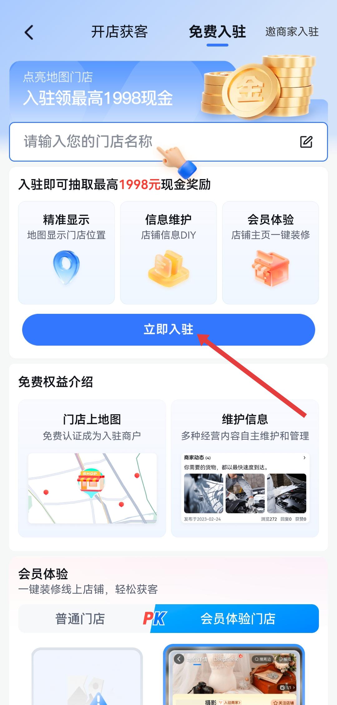 2、在开店获客免费入驻的页面,需要点击蓝色立即入驻的按钮,进入商户入驻信息的填写环节。