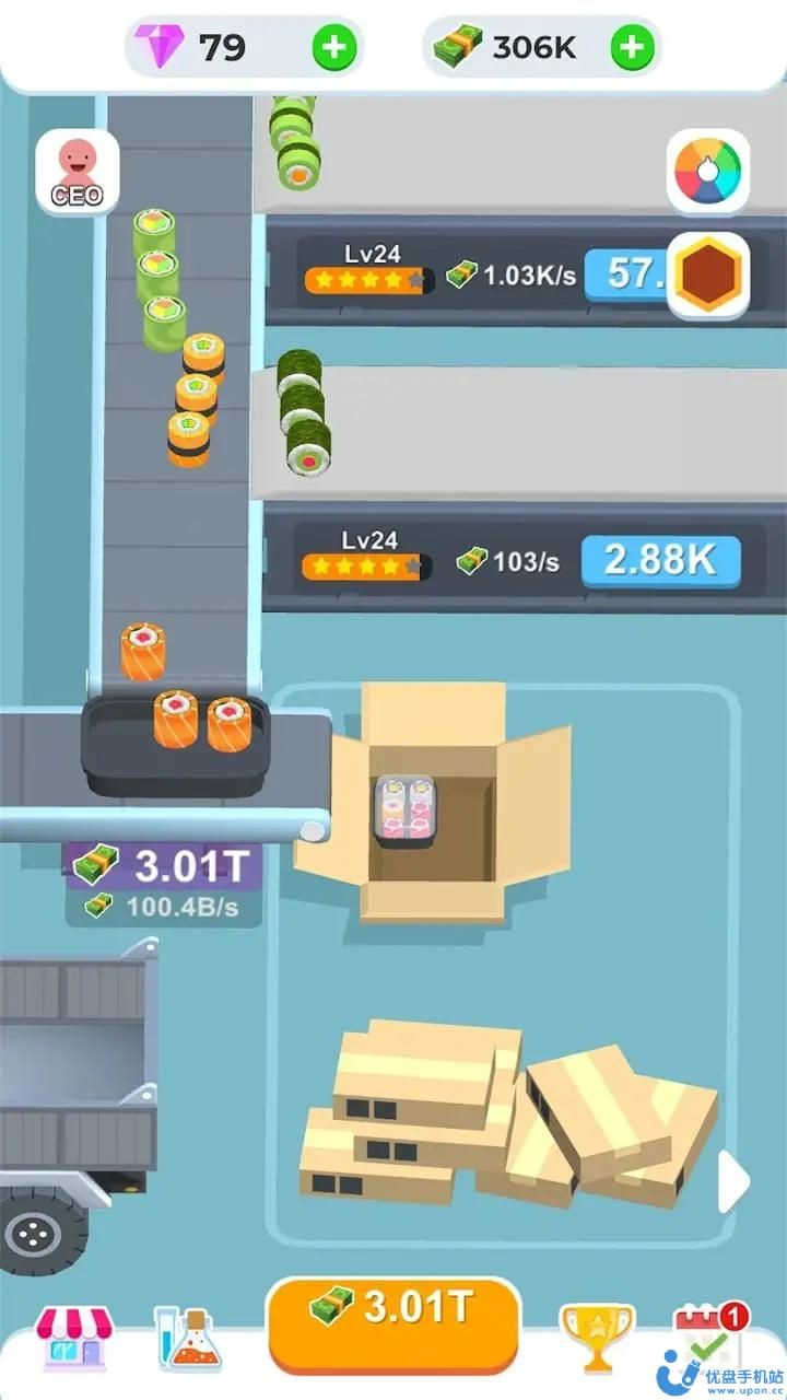 2、丰富的娱乐玩法,升级机器,不断制作寿司,完成订单,扩建工厂,玩法非常有趣;