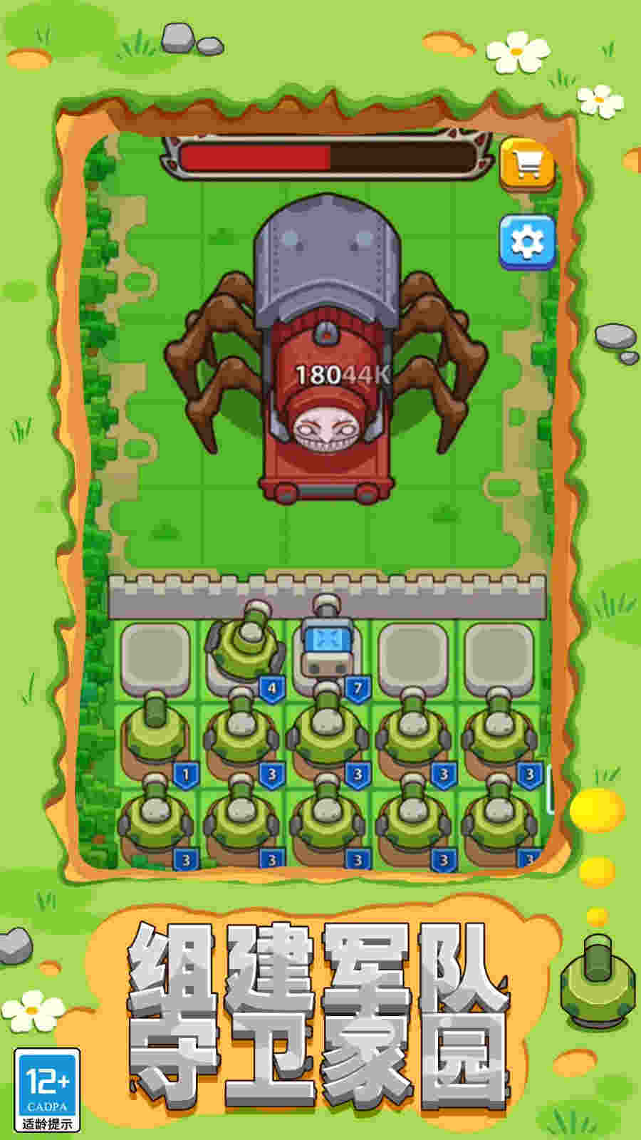 3、玩家体验无尽的精彩战斗,场景有很多格子,玩家解锁炮塔并将它们放置在网格中以构建强大的塔防。