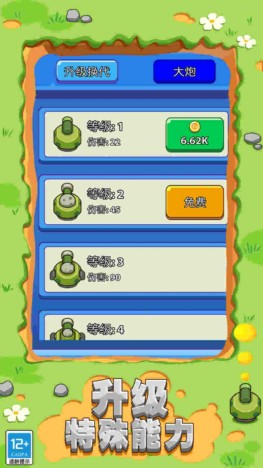 2、将自己的炮塔放置在方格上,构建出强大的塔防,你可以升级你的武器装备和防御塔;
